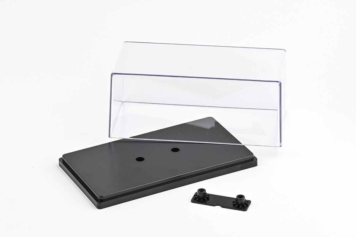 Vitrínková krabička Abrex 1:43. Rozměry (d x š x v): 147 x 82 x 65mm. Součástí kompletu je čirý kryt + černý podstavec s dvěma kruhovými otvory o průměru 75mm a roztečí 32mm bez potisku + kotevní plastové účko. Neobsahuje šroubky.