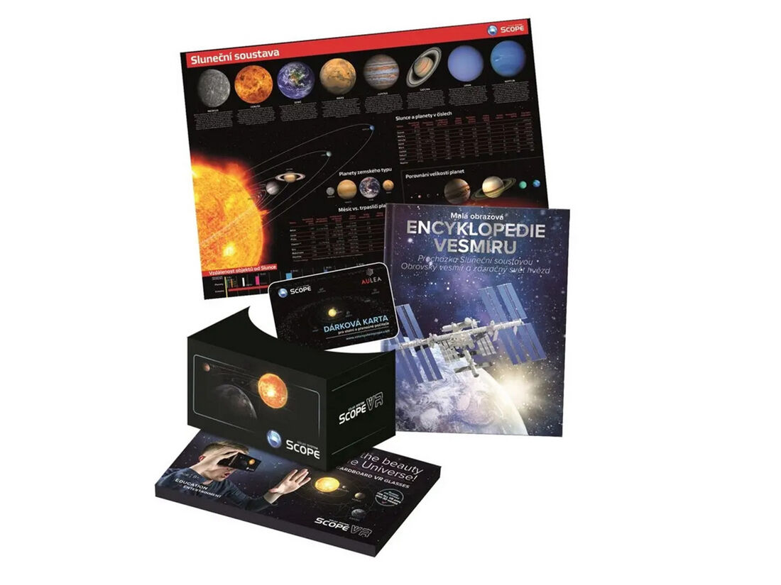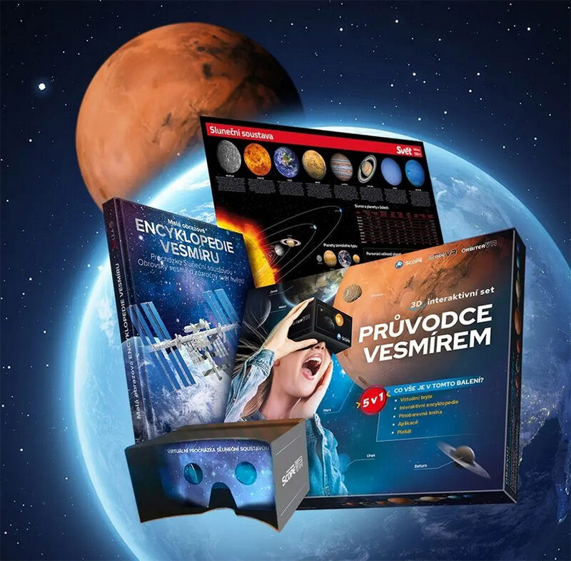 Skutečné vesmírné dobrodružství na vlastní oči. Objevte sluneční soustavu dotykem ruky. Objevte vesmír se spolehlivými kartonovými brýlemi, které doslova změní chytrý telefon na okno do vesmíru. VR brýle jsou doplněny o fixační prvky pro různé druhy telefonů. Interaktivní způsob učení o vesmírných faktech s unikátním 3D modelem planetární soustavy. Jeden z nejkomplexnějších modelů solárního systému na světě.