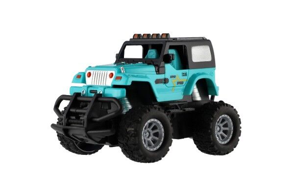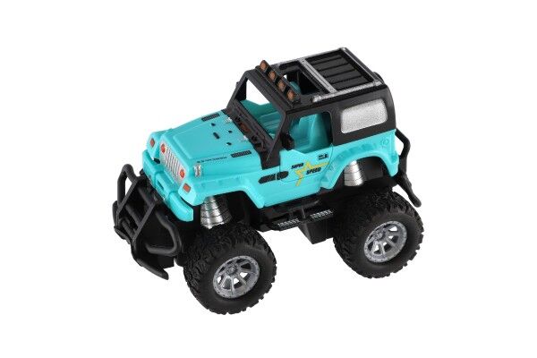 Auto RC terénní 14cm plast 27MHz na baterie se světlem tyrkysové v krabici 20x11x10cm