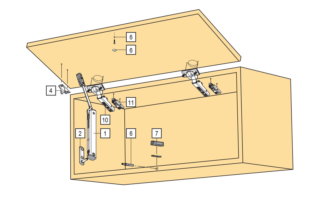 Jednostranný zdvihací mechanizmus s hodnotou LF 200-1000. Výpočet LF - výška korpusu KH (mm) x hmotnost čela, vč. dvojnásobné hmotnosti úchytky (kg). Upozornění: v případě využití po obou stranách se faktor výkonnosti zdvojnásobí. Nutno použít v kombinaci s tlumenými panty.