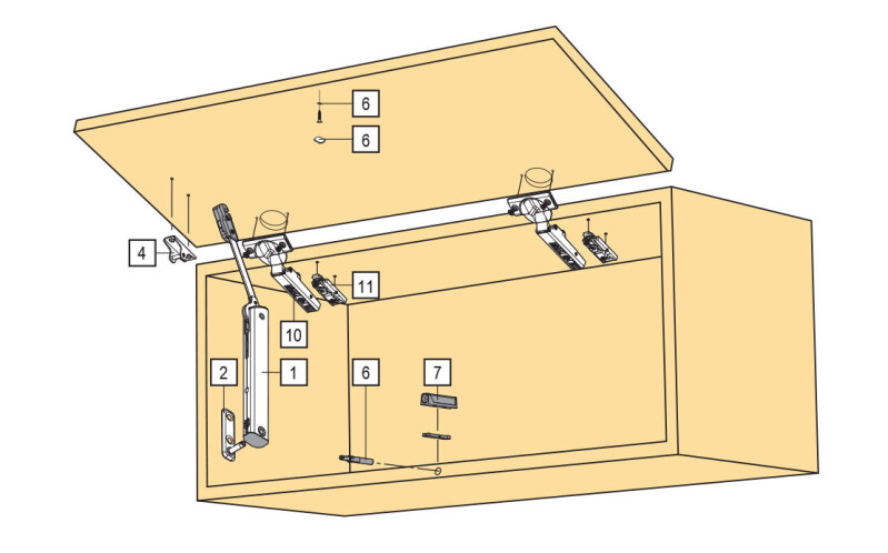 • výklopné kování, určené pro malé výklopy ve vysokých skříních a horních skříňkách