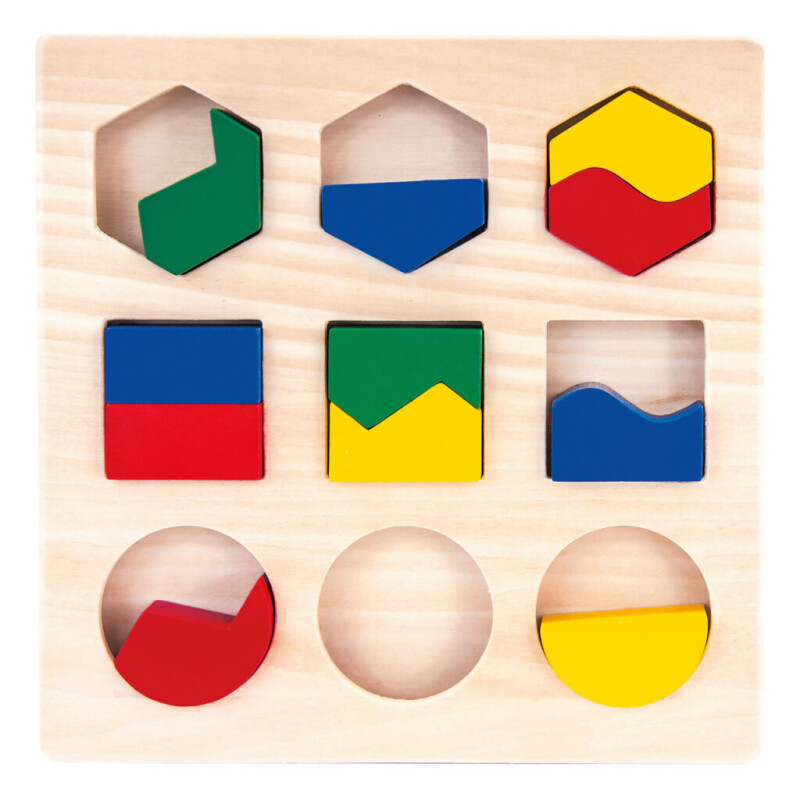Dřevěná barevná skládanka pro děti, které se seznamují s geometrickými tvary. Skvělé pro cvičení představivosti a schopnosti kombinovat. Hračka je robustní, vyrobena ze silné překližky a masivního dřeva.
