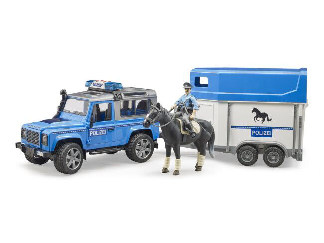I v Bruder světě je potřeba dohlížet na dodržování zákonů a to zajistí například tato sada. Policejní Land Rover s přepravníkem na koně, policistou a figurkou koně. Land Rover má spoustu funkčních prvků, na což jsme u modelů Bruder zvyklí. Policejní auto je vybaveno majákem se světlem a zvukem. Land Rover Bruder 2588 má otevírací dveře i kapotu, maják se zvukovými efekty, rezervu na zadních dveřích a je možné jej řídit pomocí dlouhého volantu. Přepravník na koně má otevírací zadní stěnu, po které může kůň bezpečně a pohodlně nastoupit, nechybí ani otevírací dveře na boku a okénka v horní části přepravníku. Přepravník je možné připojit za traktory i osobní auta Bruder. Figurka policisty je vybavena pouty, obuškem, vysílačkou a samozřejmě nechybí ani policejní čepice. Součástí balení je také figurka koně, uzda a sedlo. Vyrobeno v Německu, z kvalitních materiálů.
