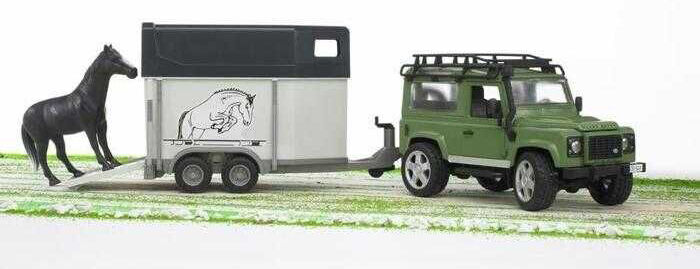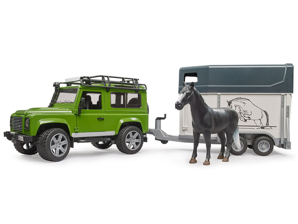 Bruder LAND ROVER DEFENDER zelený s přívěsem a koněm je térénní dvounápravový vůz propracovaný do detailů. Má otevíratelný motorový prostor s detailním zpracováním pohonného agregátu, otevírání dveří, odpružené obě nápravy, otevírání zadních dveří nákladového prostoru, odnímatelné závěsné zařízení, střešní zahrádku, funkční řízení. Vůz lze ovládat buď klasickým volantem na místě řidiče, nebo je možné použít prodloužený volant a zasunout jej do adaptéru ve středovém panelu LAND ROVERU po otevření střešního okna, což usnadní ovládání vozu. Prodloužený volant je součástí vozu a je umístěn v podvozku. Přívěs má zadní nájezd a otvíratelné zadní i boční dveře. Vyrobeno v Německu, z kvalitních materiálů.