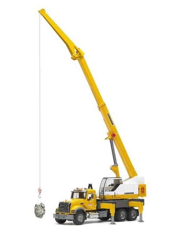 MACK Granite Liebherr autojeřáb je nádherný model amerického vozu s chromovými doplňky. Jeřáb v celé délce ční až do výšky 130cm!! Vysokou stabilitu vozidla mají na starosti nastavitelné opěrné nohy a může být také použit stabilizační segment umístěný v zadní části vozidla, který může být naplněn pískem. MACK Granite má nový lanový naviják s blokovácím zařízením a ochranou proti přetížení. Lano se dá vysunout až do délky 2m!! Výšku jeřábu je možné nastavit pomocí regulačního knoflíku se zamykacím mechanismem a tělo jeřábu je otočné o 360°. Kabina je zasklena vysoce odolným průhledným polykarbonátem a má otevíratelné posuvné dveře. Dále má sklopná zrcátka, otevíratelnou kapotu motoru, profilové pneumatiky a chromový vzhled nárazníku, předního rámu, zrcátek a výfuku. Vyrobeno v Německu, z kvalitních materiálů.