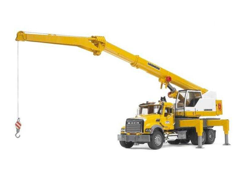 MACK Granite Liebherr autojeřáb je nádherný model amerického vozu s chromovými doplňky. Jeřáb v celé délce ční až do výšky 130cm!! Vysokou stabilitu vozidla mají na starosti nastavitelné opěrné nohy a může být také použit stabilizační segment umístěný v zadní části vozidla, který může být naplněn pískem. MACK Granite má nový lanový naviják s blokovácím zařízením a ochranou proti přetížení. Lano se dá vysunout až do délky 2m!! Výšku jeřábu je možné nastavit pomocí regulačního knoflíku se zamykacím mechanismem a tělo jeřábu je otočné o 360°. Kabina je zasklena vysoce odolným průhledným polykarbonátem a má otevíratelné posuvné dveře. Dále má sklopná zrcátka, otevíratelnou kapotu motoru, profilové pneumatiky a chromový vzhled nárazníku, předního rámu, zrcátek a výfuku. Vyrobeno v Německu, z kvalitních materiálů.