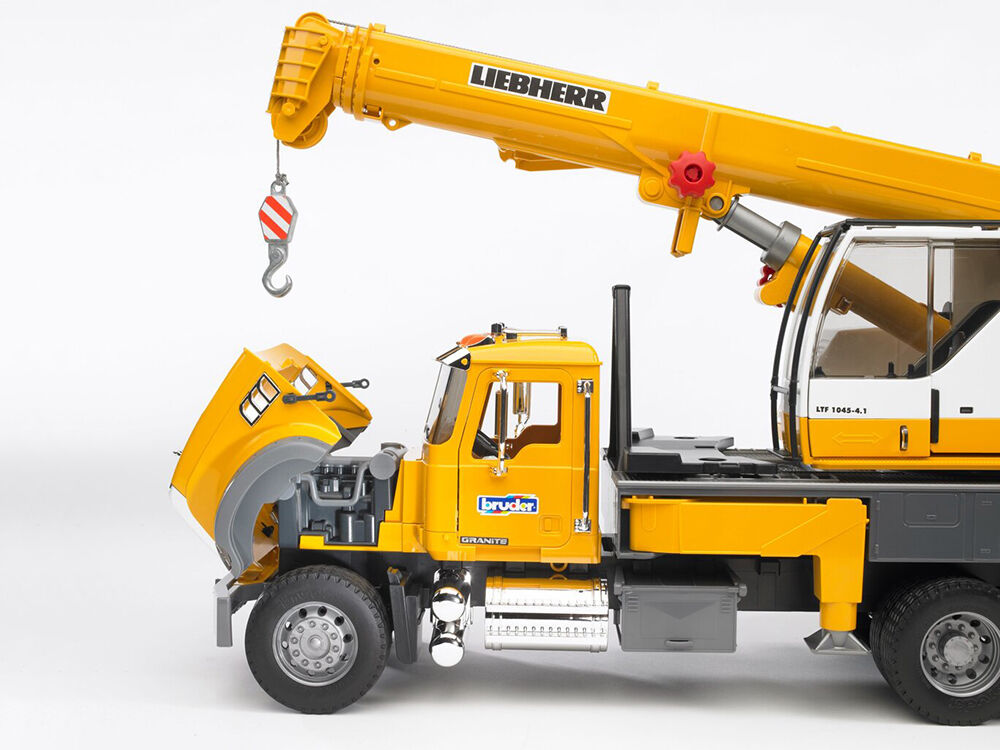 Luxusní model nákladního vozu MACK Granite s jeřábem Liebherr značky Bruder je vyveden v měřítku 1:16.