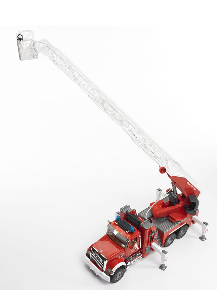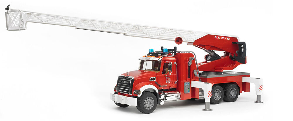Třínápravový hasičský vůz MACK Granit s funkční stříkačkou a otočným výsuvným žebříkem, který lze vysunout až do délky 120 cm! Výsuvné rameno je otočné o 360°. Nechybí samozřejmě stabilizační podpěry a součástí je také maják se sirénou (BR2801). Hasičský vůz má otevíratelné dveře kabiny, sklopná vnější zrcátka a čelní okno vyrobené z kvalitního průhledného palykarbonátu. Je osazen měkkými profilovanými pneumatikami a je možné nahlédnout pod kapotu na blok motoru. Na košíku žebříku je držák na hadici, kterou lze navíjet pomocí boční kličky. Kompatibilní s postavami Bworld. Vyrobeno v Německu, z kvalitních materiálů.