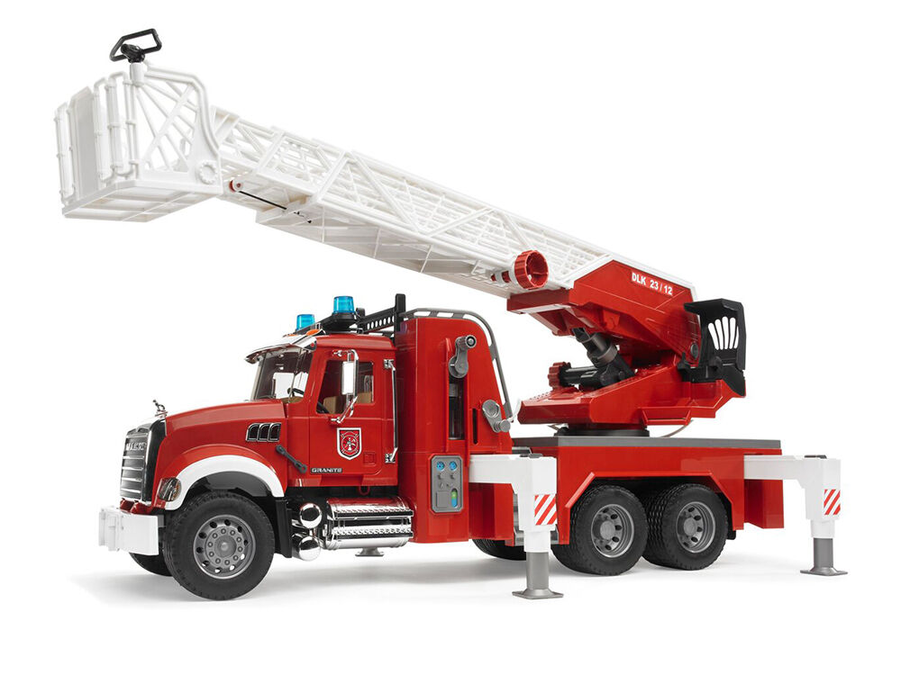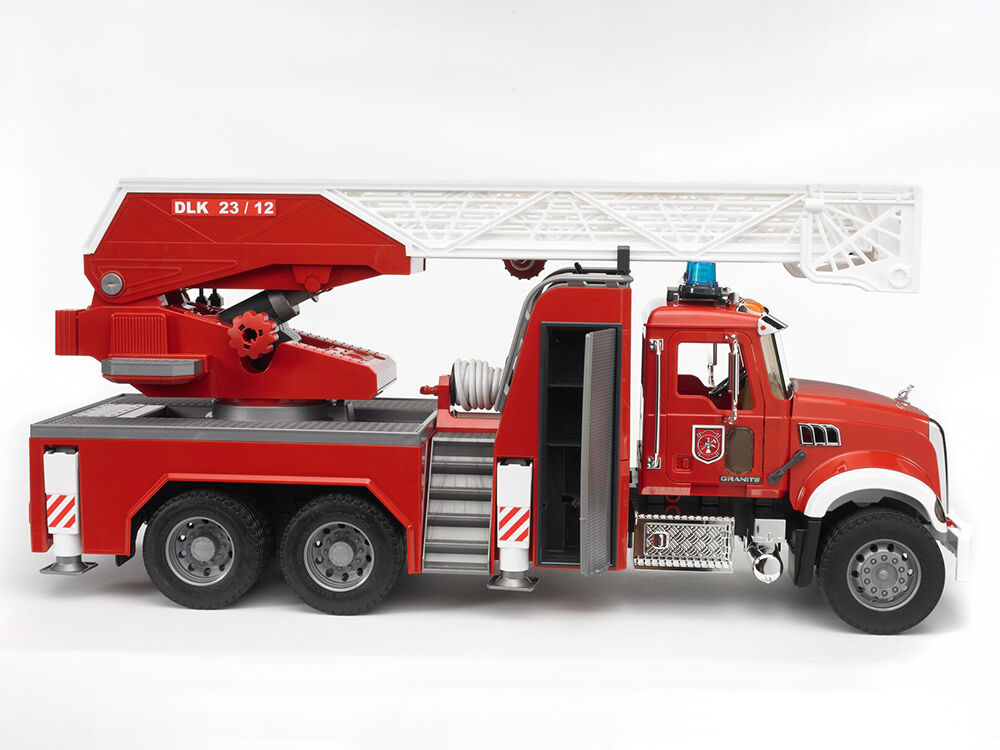 Třínápravový hasičský vůz MACK Granit s funkční stříkačkou a otočným výsuvným žebříkem, který lze vysunout až do délky 120 cm! Výsuvné rameno je otočné o 360°. Nechybí samozřejmě stabilizační podpěry a součástí je také maják se sirénou (BR2801). Hasičský vůz má otevíratelné dveře kabiny, sklopná vnější zrcátka a čelní okno vyrobené z kvalitního průhledného palykarbonátu. Je osazen měkkými profilovanými pneumatikami a je možné nahlédnout pod kapotu na blok motoru. Na košíku žebříku je držák na hadici, kterou lze navíjet pomocí boční kličky. Kompatibilní s postavami Bworld. Vyrobeno v Německu, z kvalitních materiálů.
