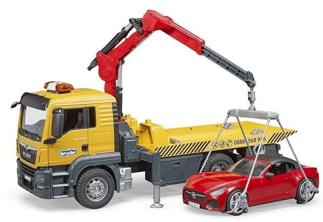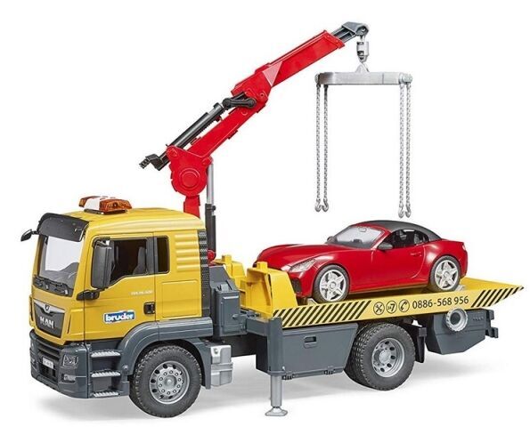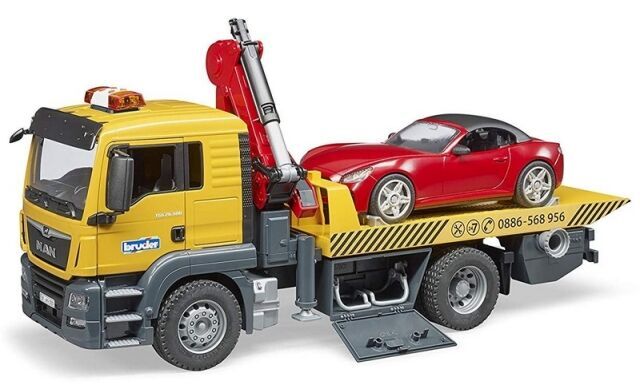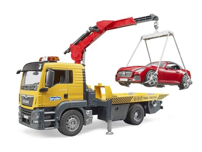 Čas od času je potřeba auta odtáhnout, ať už kvůli nějakému defektu nebo třeba kvůli převozu na závodiště či jinam. Odtahovka MAN TGS Bruder 3750 má jako všechny modely Bruder zajímavé funkční prvky např. maják, sklopná zrcátka, profilované pneumatiky a pohyblivé rameno, kterým bez problémů naloží každé osobní auto. Auto může také najet na sklopný valník odtahovky. Osobní auto má odnímatelnou střechu. Rozšiřte svoji Bruder sbírku o tento model odtahovky MAN TGS s červeným sportovním autem Bruder. Kam převezete svůj nový červený sporťák? Vyrobeno v Německu, z kvalitních materiálů.