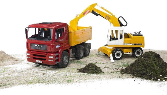 Nákladní auto MAN TGA je klasický sklápěč s měkkými pneumatikami a sklopnou korbou. Součástí setu je bagr Liebherr na nakládání materiálu. Bagr má stabilizační výsuvné opěrné nohy, profilové pneumatiky a funkční rýpadlo s otočnou kabinou. Kabina s plně funkčním ramenem se lžící se otáčejí o 360°. Doporučujeme k vozu dokoupit a nainstalovat světelný a zvukový maják BR2801. Vyrobeno v Německu, z kvalitních materiálů.