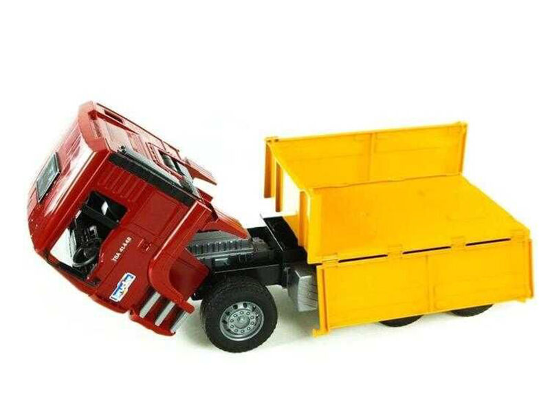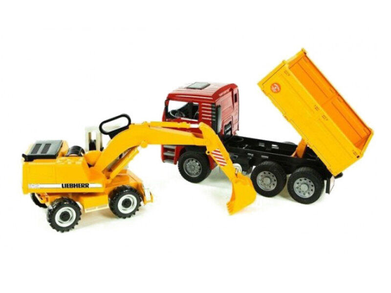 Nákladní auto MAN TGA je klasický sklápěč s měkkými pneumatikami a sklopnou korbou. Součástí setu je bagr Liebherr na nakládání materiálu. Bagr má stabilizační výsuvné opěrné nohy, profilové pneumatiky a funkční rýpadlo s otočnou kabinou. Kabina s plně funkčním ramenem se lžící se otáčejí o 360°. Doporučujeme k vozu dokoupit a nainstalovat světelný a zvukový maják BR2801. Vyrobeno v Německu, z kvalitních materiálů.