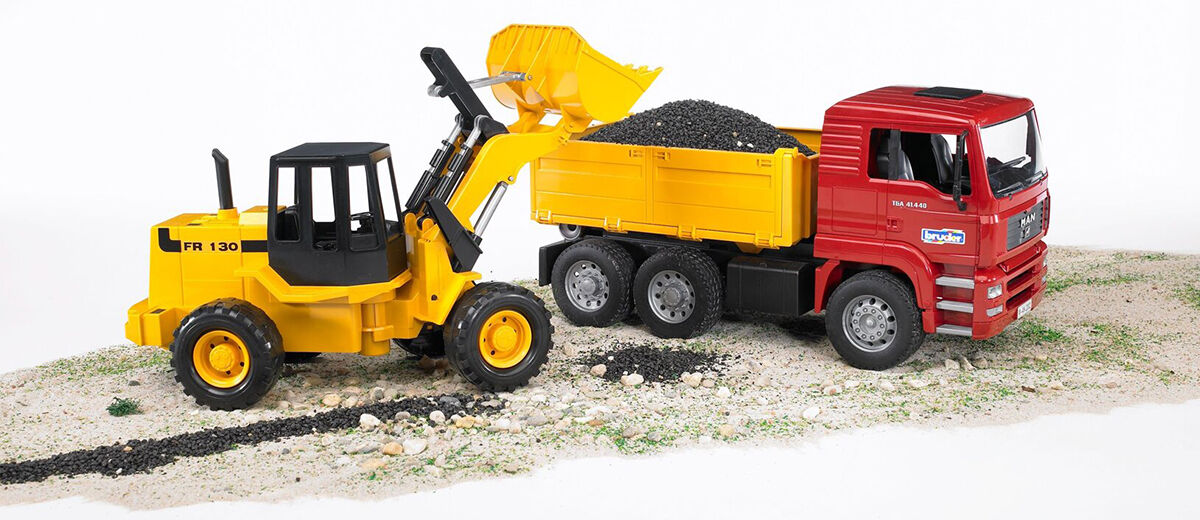 Bruder 02752 MAN sklápěč a čelní nakladač FR130 to je nákladní auto s červenou kabinou a žlutou sklápěčkou a žlutý nakladač s černou kabinou. Kabina auta je odklápěcí a sklápečka na autě plně funkční. I sklápěcí bočnice jsou funkční jako na skutečném vozidle. Čelní nakladač FR130 má pohyblivý kloub a zvedací a vyklápěcí lžíci. Vyrobeno v Německu, z kvalitních materiálů.