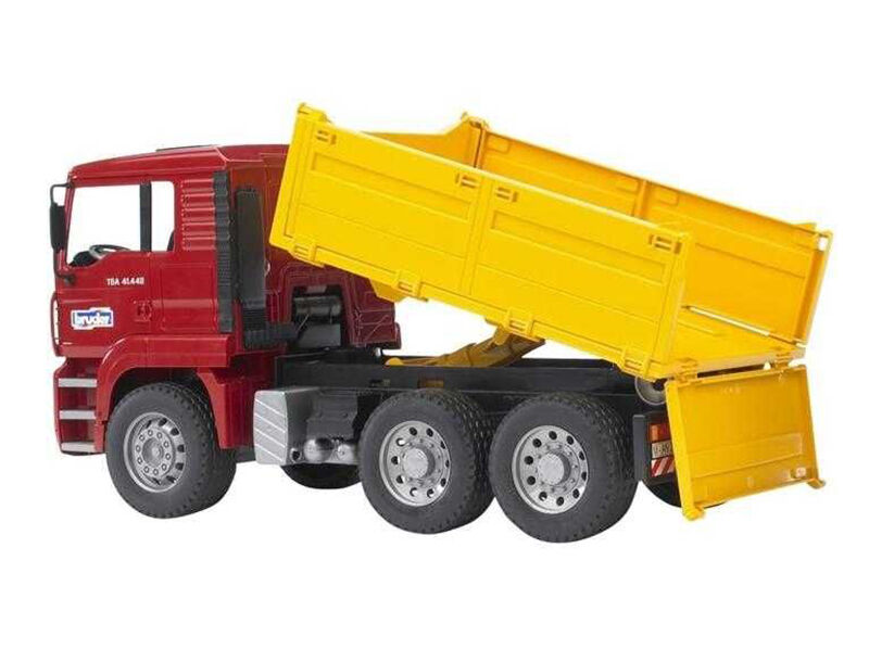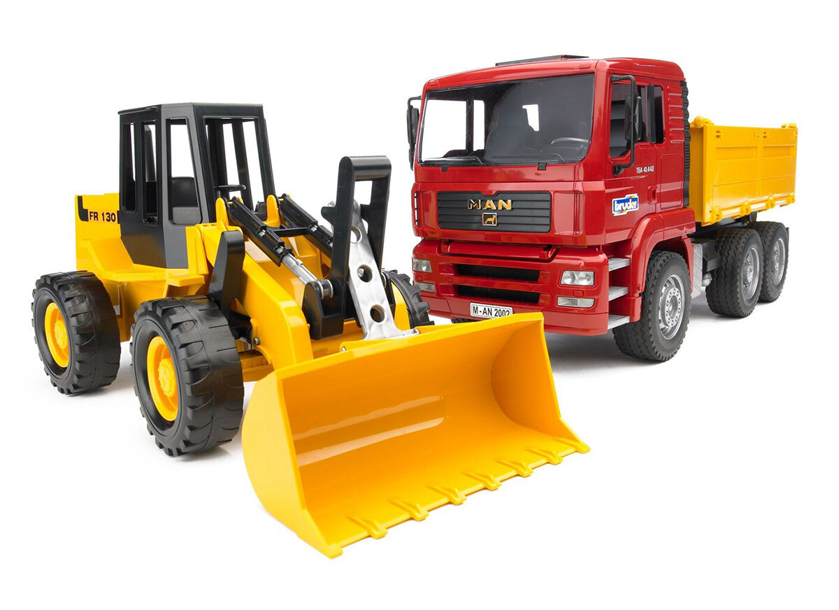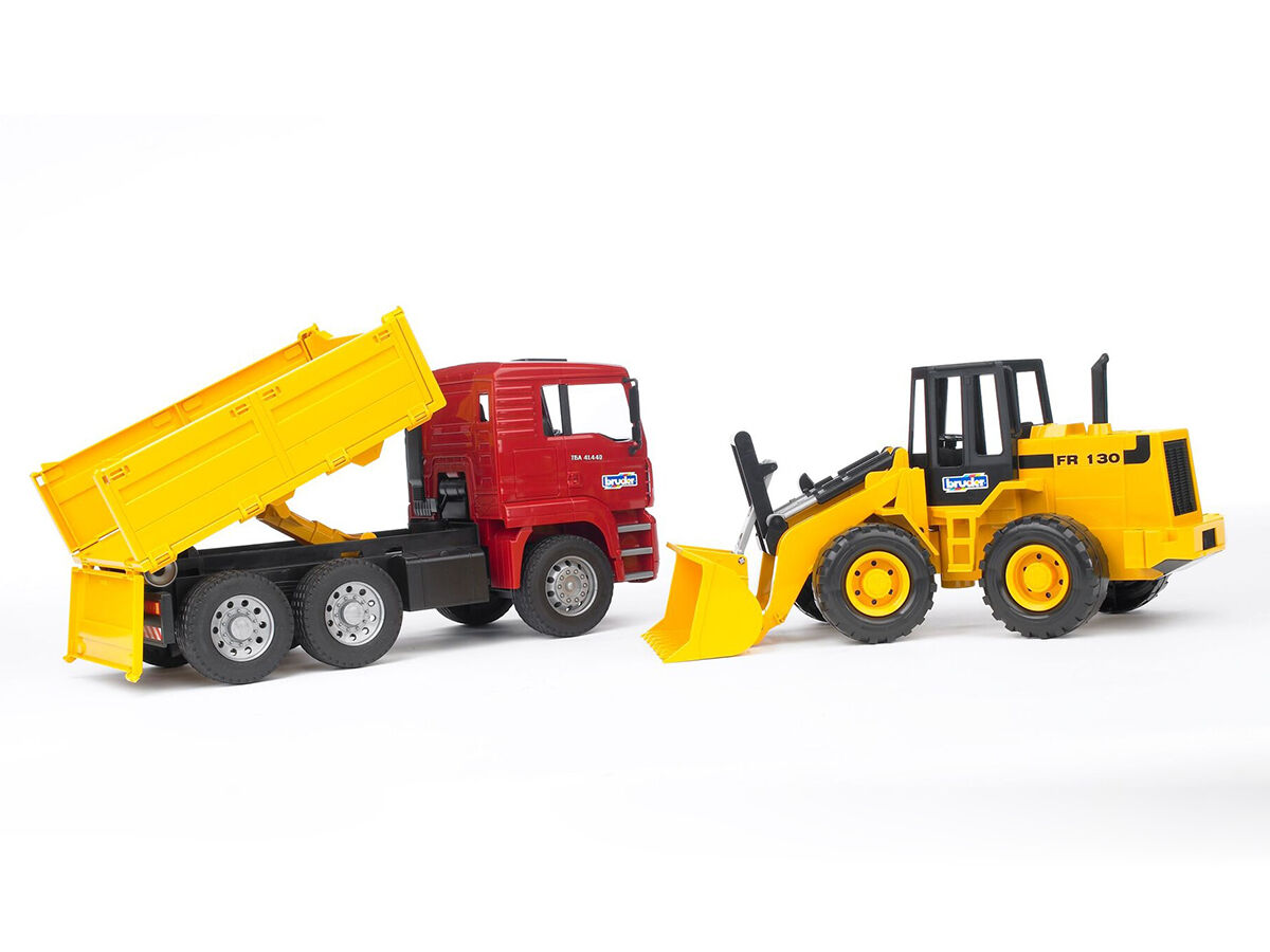 Bruder 02752 MAN sklápěč a čelní nakladač FR130 to je nákladní auto s červenou kabinou a žlutou sklápěčkou a žlutý nakladač s černou kabinou. Kabina auta je odklápěcí a sklápečka na autě plně funkční. I sklápěcí bočnice jsou funkční jako na skutečném vozidle. Čelní nakladač FR130 má pohyblivý kloub a zvedací a vyklápěcí lžíci. Vyrobeno v Německu, z kvalitních materiálů.