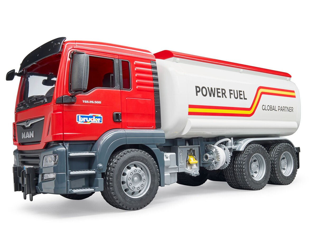 Bruder - Nákladní auto MAN TGS - cisterna Model MAN TGS je dokonalé a všestranné vozidlo. Cisterna MAN TGS disponuje funkční a moderní kabinou kam lze posait figurku řidiče. Tento model má otevírací dveře, sklopná zpětná zrcátka a nově vyvinutou a plně funkční cisternu. Nádrž pojme cca 390 ml vody. Tlak v cisterně se udržuje pomocí ručně ovládaného čerpadla stlačeného vzduchu. Vypustit vodu pak můžete ventilem s pojistnou pákou. Gumová hadice je navinutá na funkčním navijáku. Jako ideální doplněk k tomuto modelu je přívěs s cisternou. Vytvoříte tak 1m dlouhý tandem cisteren. V zadní části je umístěn žebřík, tak aby obsluha mohla kontrolovat cisternu ze shora. Auto je možné ještě doplnit světelným a zvukovým majákem. Nákladní auto má sklápěcí zpětná zrcátka, otevírací dveře, otevírací kapotu motoru, žebrík na zadní straně cisterny, funkční čerpadlo, vypouštěcí jednotku s pákou nádrže na vodu (390 ml).