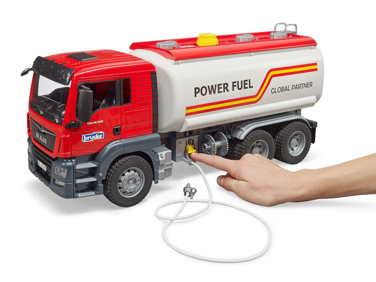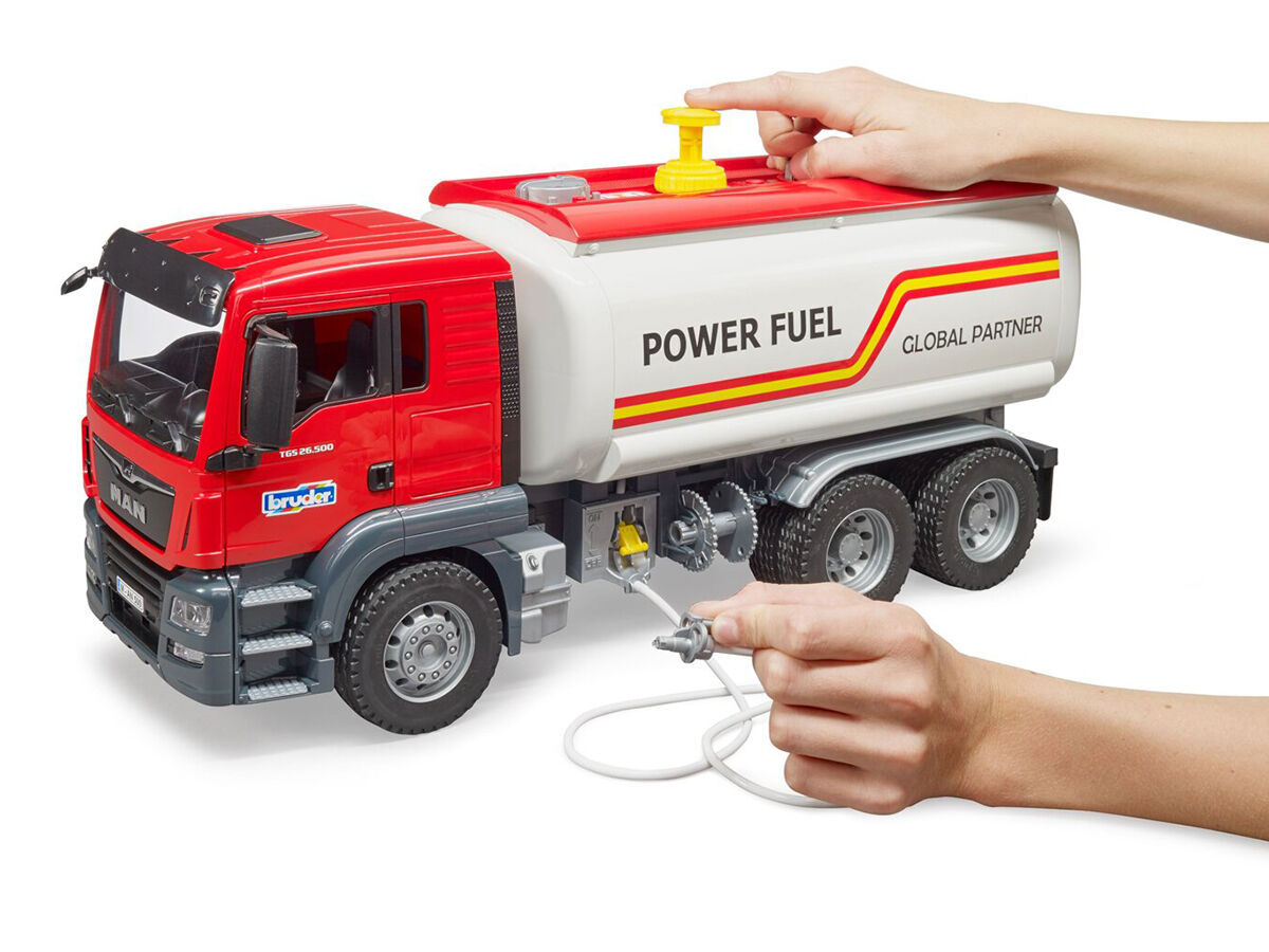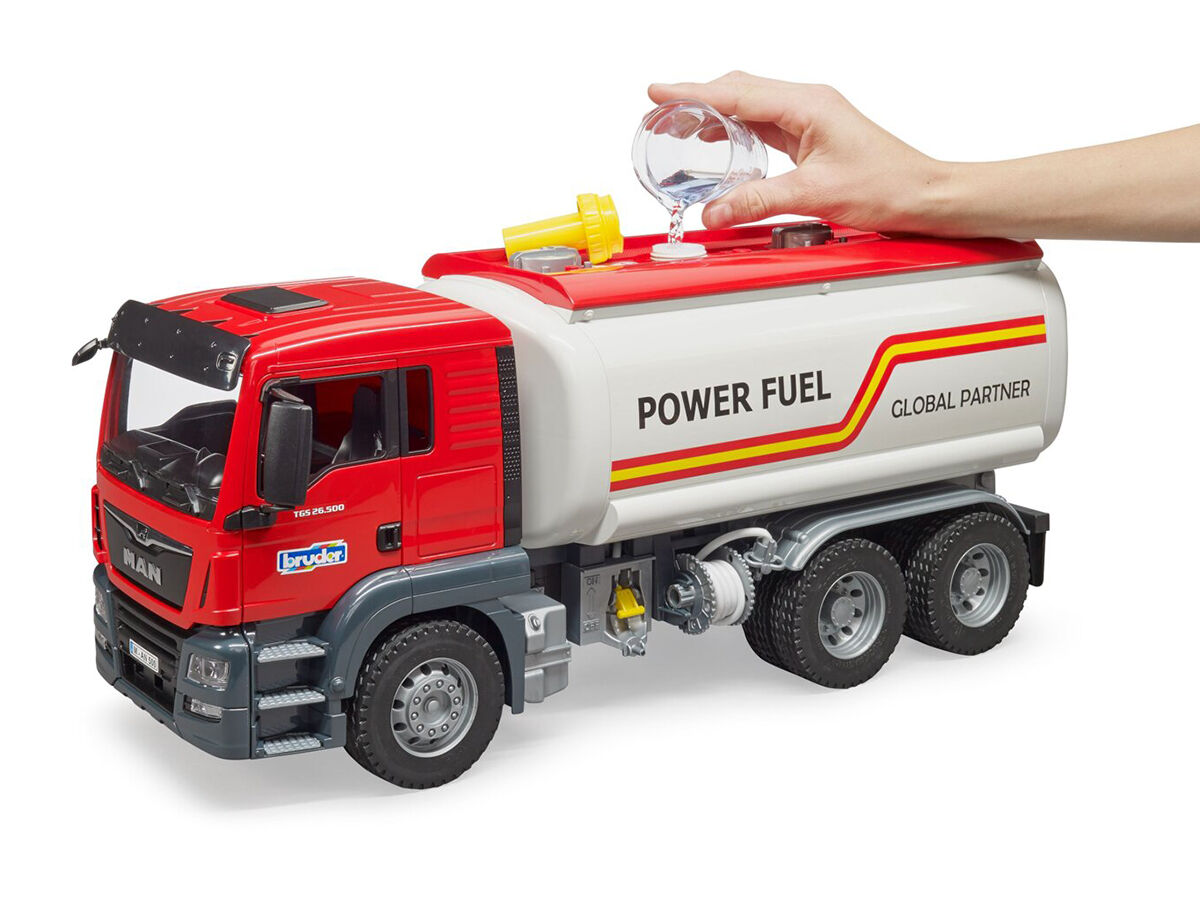 Bruder - Nákladní auto MAN TGS - cisterna Model MAN TGS je dokonalé a všestranné vozidlo. Cisterna MAN TGS disponuje funkční a moderní kabinou kam lze posait figurku řidiče. Tento model má otevírací dveře, sklopná zpětná zrcátka a nově vyvinutou a plně funkční cisternu. Nádrž pojme cca 390 ml vody. Tlak v cisterně se udržuje pomocí ručně ovládaného čerpadla stlačeného vzduchu. Vypustit vodu pak můžete ventilem s pojistnou pákou. Gumová hadice je navinutá na funkčním navijáku. Jako ideální doplněk k tomuto modelu je přívěs s cisternou. Vytvoříte tak 1m dlouhý tandem cisteren. V zadní části je umístěn žebřík, tak aby obsluha mohla kontrolovat cisternu ze shora. Auto je možné ještě doplnit světelným a zvukovým majákem. Nákladní auto má sklápěcí zpětná zrcátka, otevírací dveře, otevírací kapotu motoru, žebrík na zadní straně cisterny, funkční čerpadlo, vypouštěcí jednotku s pákou nádrže na vodu (390 ml).