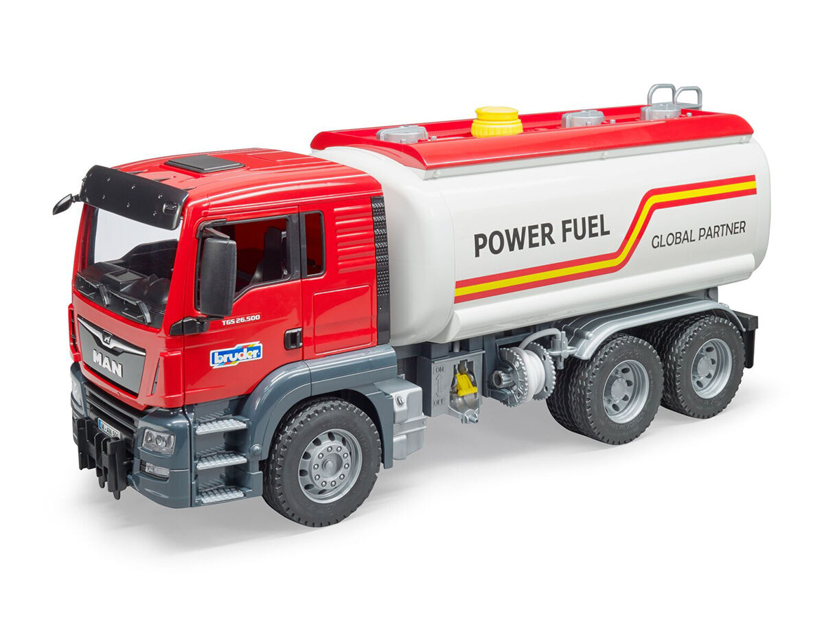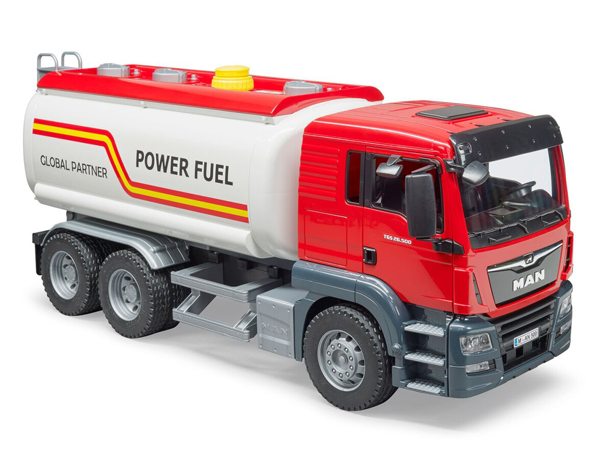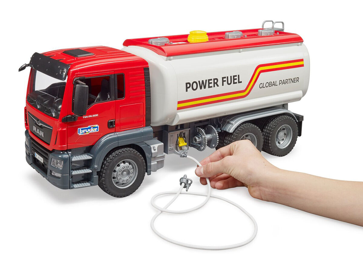 Bruder - Nákladní auto MAN TGS - cisterna Model MAN TGS je dokonalé a všestranné vozidlo. Cisterna MAN TGS disponuje funkční a moderní kabinou kam lze posait figurku řidiče. Tento model má otevírací dveře, sklopná zpětná zrcátka a nově vyvinutou a plně funkční cisternu. Nádrž pojme cca 390 ml vody. Tlak v cisterně se udržuje pomocí ručně ovládaného čerpadla stlačeného vzduchu. Vypustit vodu pak můžete ventilem s pojistnou pákou. Gumová hadice je navinutá na funkčním navijáku. Jako ideální doplněk k tomuto modelu je přívěs s cisternou. Vytvoříte tak 1m dlouhý tandem cisteren. V zadní části je umístěn žebřík, tak aby obsluha mohla kontrolovat cisternu ze shora. Auto je možné ještě doplnit světelným a zvukovým majákem. Nákladní auto má sklápěcí zpětná zrcátka, otevírací dveře, otevírací kapotu motoru, žebrík na zadní straně cisterny, funkční čerpadlo, vypouštěcí jednotku s pákou nádrže na vodu (390 ml).