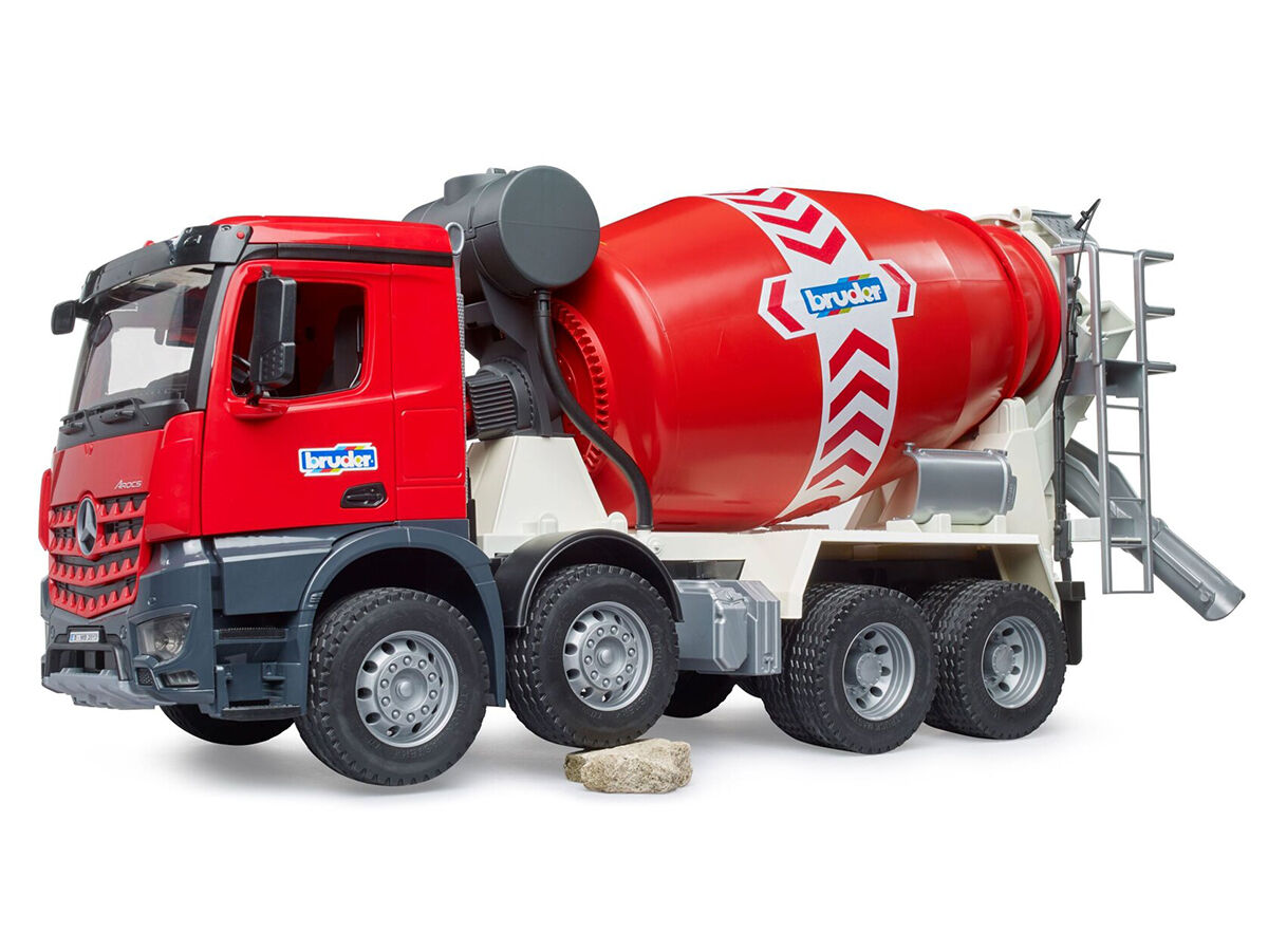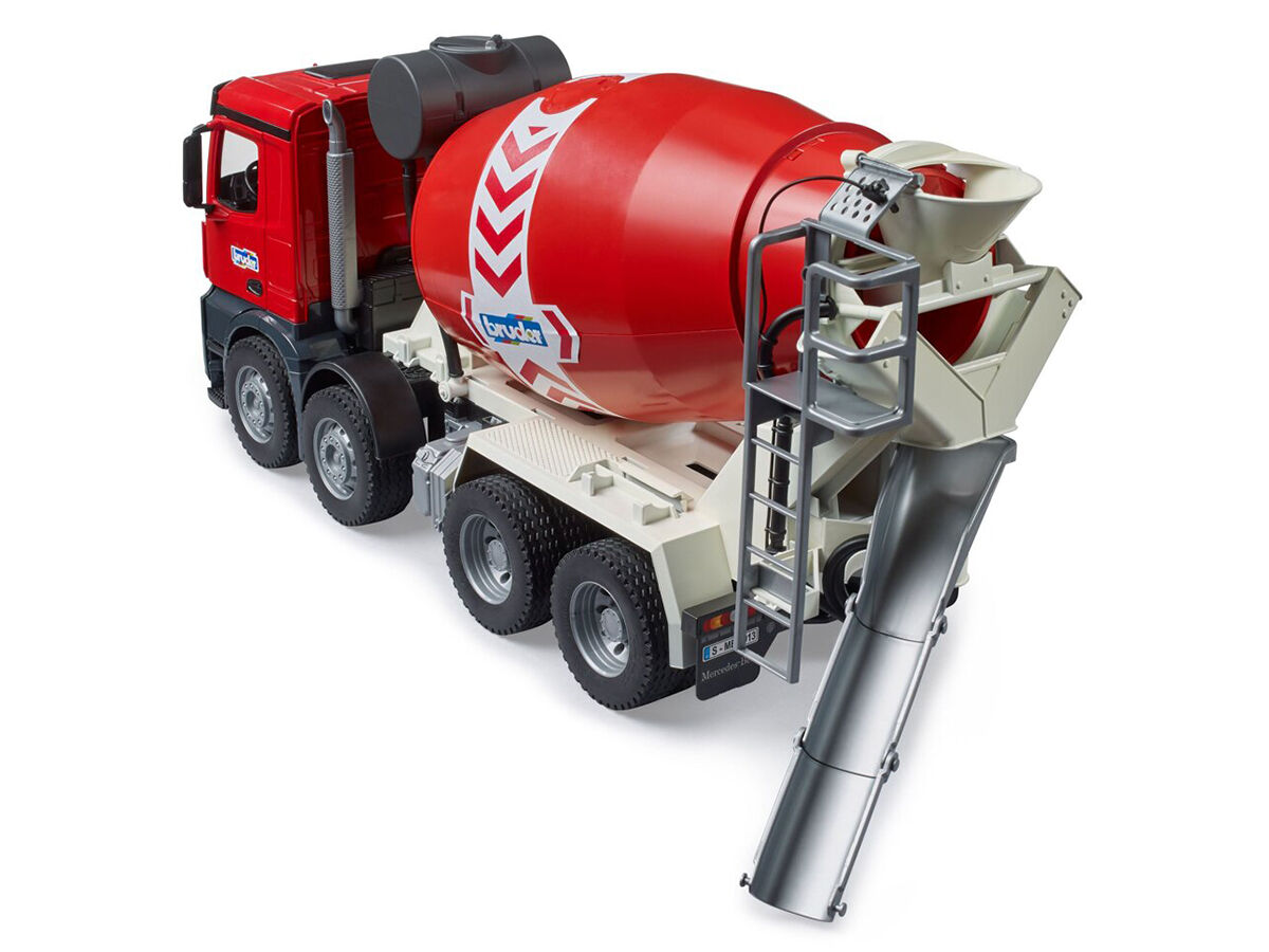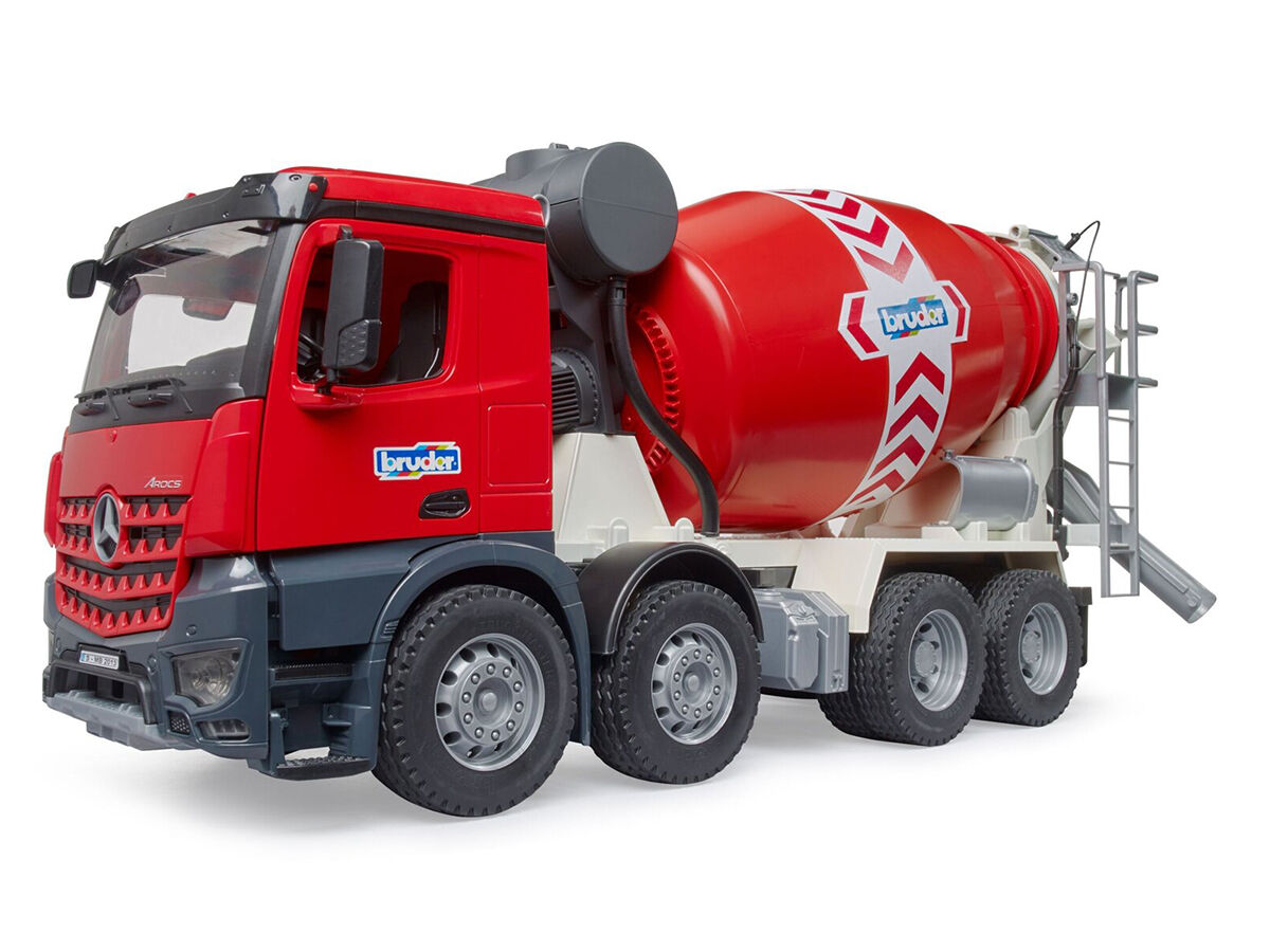 Výkon, odolnost a účinnost jsou často rozhodujícími prvky pracovního dne na silnicích a staveništích. Proto byl nový Mercedes-Benz Arocs vyvinut speciálně pro tyto potřeby. Těmto technickým vlastnostem byl přizpůsoben i design. Například přední část masky chladiče je navržena v typickém vzhledu vozu Arocs, který odráží jeho obrovskou sílu. Díky otevíracím dveřím mohou do vozu nastupovat dělníci v podobě figurek Bruder. Buben míchačky je otočný a lze v něm míchat potřebný materiál. Změnou směru otáčení je možné z bubnu míchaný materiál vypustit. Šnekový dopravník na vnitřní straně bubnu dopravuje náklad do výsypného žlabu v zadní části.