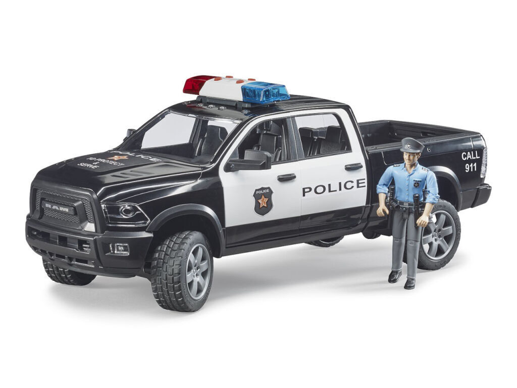 Policejní Pick-up s pohonem 4 x 4 se hodí do každého terénu, včetně méně přístupných lesů nebo horských oblastí. Terénní auto v barvách policie má světelný a zvukový maják, otevírací dveře a zadní čelo, nechybí ani zadní tažné zařízení a řiditelná přední náprava. Policejní auto RAM Bruder je možné řídit prodlouženým volantem, který je součástí balení. Místo za volantem je přizpůsobeno figurkám Bruder BWORLD.