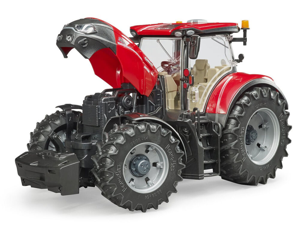 Série Optum je výkonný, kompaktní a velmi snadno ovladatelný traktor. Model má prosklenou kabinu s otevíratelnými dveřmi. Kapota jde vyklopit a umožní pohled na velký motor. Odpružená náprava s prodlouženým volantem dodá traktoru výborné manévrovací schopnosti, ať už v interiéru nebo venku. Case Optum má nápravy s odnímatelnými koly. Traktor je kompatibilní s Bworld, takže do kabiny jde posadit figurka řidiče. K traktoru můžete připojit i čelní nakladač (BR3333) nebo přídavná kola, aby se nebořil v těžkém terénu. Vyrobeno v Německu, z kvalitních materiálů.