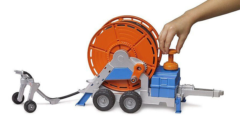 Ať už se jedná o sportovní hřiště, školky, pole, sady nebo jiné velké plochy, všude tam, kde je potřeba rovnoměrná a stálá dodávka vody, mají zavlažovače své místo. Tento důležitý stroj pro úspěšné zemědělství je nyní k dispozici. Pomocí navijáku ovládaného kličkou mohou mladí farmáři navinout na zavlačovací vůz 1,8 m dlouhou hadici, na kterou je připojen postřikovač. Součástí je i nádrž s funkčním čerpadlem. Díky systému čerpadla lze vodu rozvádět snadno a realisticky.