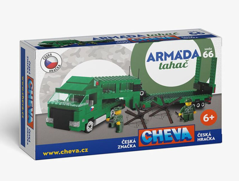 Tato zbrusu nová sada stavebnice Cheva - Tahač je dalším z doplňků k základním verzím stavebnice Cheva. Stavebnice Cheva 66 obsahuje více jak 500 dílků, z nichž lze sestavit Tahač těžké vojenské techniky a přenést se tak do světa válečných bitev. Klasická česká stavebnice Cheva je variabilní a polytechnická stavebnice. Stavebnice Cheva povzbuzuje dětskou zručnost, představivost a kreativitu. Stavebnice Cheva se skládají z různých stavebnic, které se dají libovolně kombinovat. Mohou tak vznikat skvělá městečka, obsahující policii, hasiče, nádraží, benzínovou stanici, taxi službu apod.