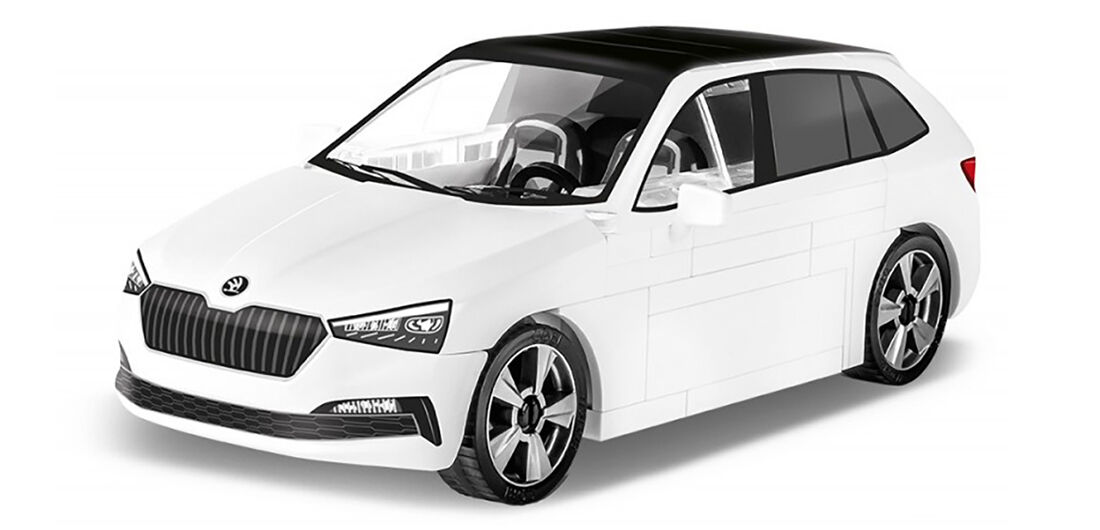 Stavebnice modelu auta Škoda Scala 1.5 TSI v bílé barvě s atraktivní černou střechou. Prosklení je vyrobeno z kvalitního transparentního plastu. Všechny modely Škoda od společnosti COBI Factory SA jsou vyrobeny pod oficiální licencí značky ŠKODA AUTO.