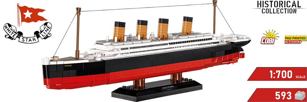 Model Titaniku od COBI v měřítku 1:700 se skládá z 593 kostek stavebnice a měří 38,5 cm na délku. Je ideální jak pro mladé stavitele, tak pro dospělé sběratele. Na podstavci s vytištěným jménem lodi vypadá mimořádně elegantně.