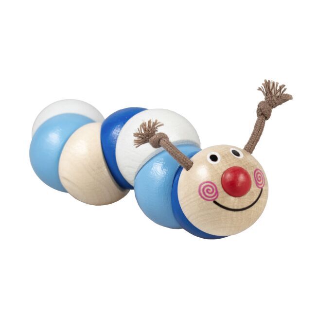 Hračka z barevných dřevěných tvarů navlečených na gumě, které se pohybují, točí a ohýbají. Délka housenky je 13 cm a je připevněna na papírové kartě. Vhodná k procvičování jemné motoriky rukou Vašich dětí již od 6ti měsíců.