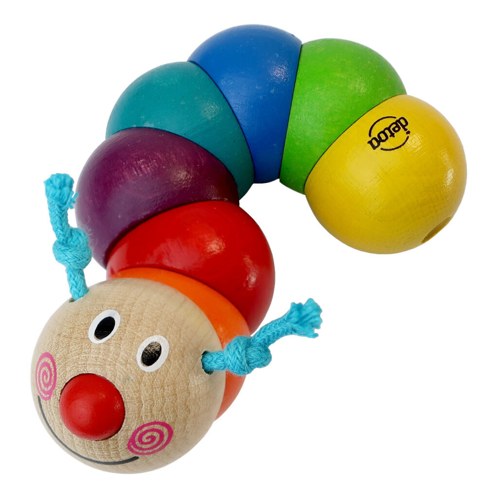 Hračka z barevných dřevěných perlí navlečených na gumě.