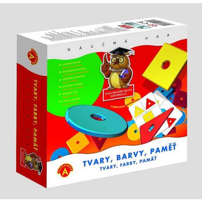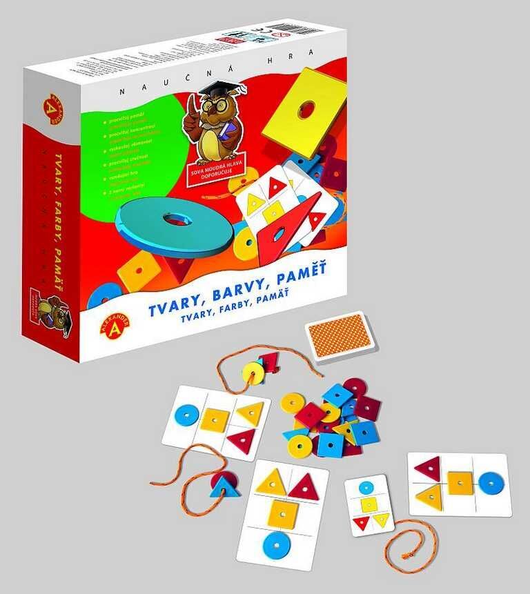Zábavná naučná hra. Učí barvy a tvary, rozvíjí paměť, postřeh a koncentraci. Pro 2-4 hráče od 5 let. Na 55 kartách najdete vzory tvořené obrázce, které odpovídají tvarům plastových žetonů. Po chvilkovém prohlédnutí karty je třeba z žetonů složit zapamatovaný vzor. Ve druhé verzi hry musí její účastníci co nejrychleji navléct žetony na provázek. Jejich barva, tvar a počet se musí shodovat s kartou, kterou si hráč na krátkou chvilku prohlédl. Nečekaně zábavná hra, která učí barvy a tvary, rozvíjí paměť, postřeh a koncentraci. Skládej žetony různách tvarů a barev podle vzorové karty. Zapoj postřeh a paměť. Zaleží na každém detalu a rychlosti abys zvítězil! Při hře se s dětmi skvěle zabaví i celá rodina. - zábavné učení barev a tvarů - trénink soustředění, postřehu a paměti - 2 různé varianty hry
