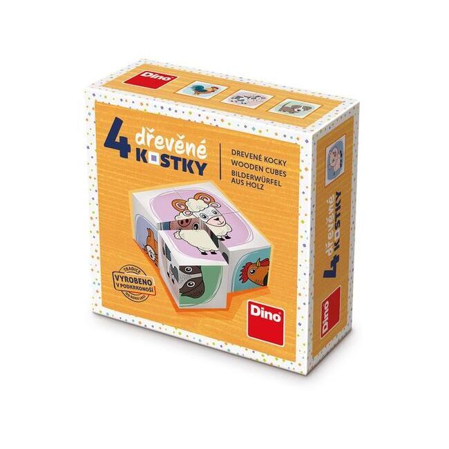 Se zvířátky si děti rozumí často už od kolébky. Kravička, ovečka, kohout či pejsek ze dřevěných kostek zaručeně nebudou výjimkou. Ze čtyř barevných krychliček si mohou už ty nejmenší děti zkoušet skládat obrázky šesti různých zvířat nebo svůj první komín. Skládat mohou podle předlohy nebo i bez ní.