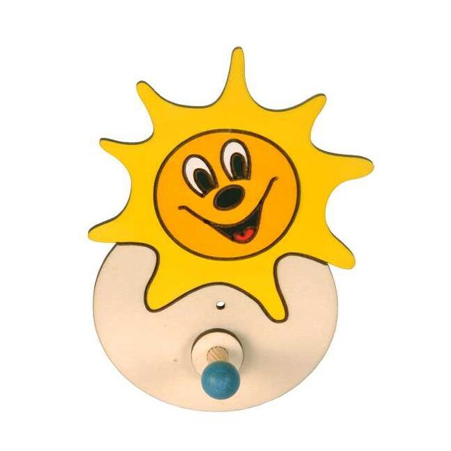 Veselý věšáček sluníčko, je krásná dekorace a zároveň i skvělá pomůcka jak naučit děti udržovat pořádek. K upevnění slouží předvrtaný otvor pro šroub, dodáváno bez spojovacího materiálu.