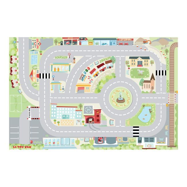 Vyroben z vysoce kvalitního plyše, s bezpečnou protiskluzovou spodní stranou, se tento extra měkký koberec stane středem hravého světa dětí. Děti s tímto podlahovým doplňkem jistě povolí uzdu představivosti, má ilustraci městečka, které mohou děti prozkoumat skrz na skrz. Najdou v něm hasičskou stanici, garáž, nemocnici, radnici, bytovou i obchodní oblast, a mnoho dalšího. Děti si jistě při hře vymyslí mnoho vlastních příběhů.