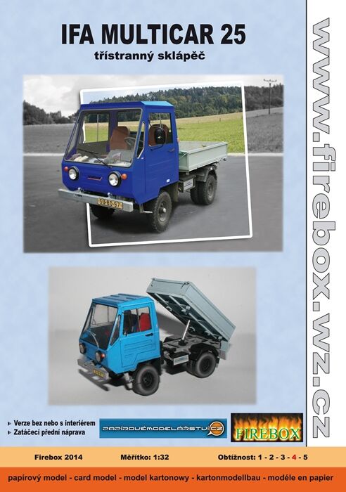 Multicar M 25 - třístranný sklápěčPředlohou je víceúčelové vozidlo, které můžete potkat na ulicích ještě dnes. Setkat se s ním můžete ve stavebnictví, kde slouží pro odvoz suti a stavebních materiálů, při úpravách parků a zahrad. Typ M25 se stal doslova hitem, do ukončení výroby v roce 1993 se vyrobilo přibližně 100 000 kusů, přičemž až 70% bylo určeno k exportu.