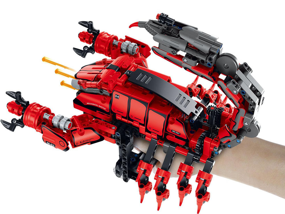 Sestavte si impozantního červeného škorpiona, který se během chvilky promění v mechanickou zbraň na ruku. Uchycení na ruku: pomocí nastavitelného mechanismu. Ovládací mechanismus na spodní straně umožňuje pohyb drápy, klepety a ocasem. Design ve stylu kybernetického brnění – vhodný i jako nositelný model.