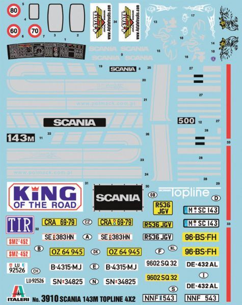 Plastikový model Italeri 3910 - truck SCANIA 143M TOPLINE 4x2 v měřítku 1:24 ke slepení. Délka modelu je 242 mm, obtížnost 4. Balení obsahuje SUPER OBTISKY a CHROMOVANÉ RÁMY NA KOLECH.