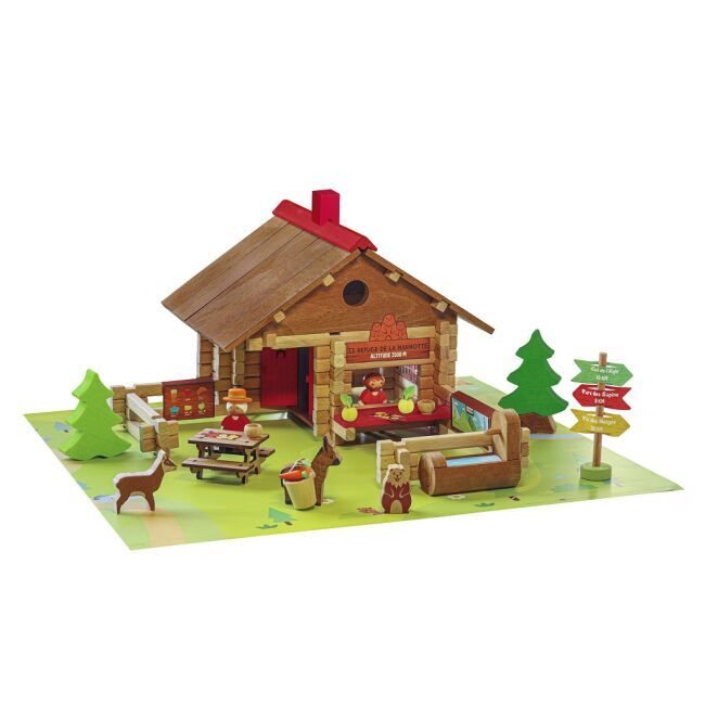 Co může být krásnější než procházky v horách? Procvičte svou obratnost a představivost při stavbě útočiště svišťů! Tento krásný domeček z mořeného dřeva je opatřen také piknikovým stolem, fontánou či roztomilými obyvateli (např. oslem, kamzíkem a svištěm). Stavebnice Jeujura Constructions mají dlouhou tradici a patří mezi klasické francouzské hračky. Nabízí série tématicky věnované chatám, domkům a farmám, ale také divokému západu a středověku. Dají se mezi sebou volně kombinovat a k řadě z nich je také nabízeno příslušenství, figurky a vozidla. Jsou vyráběny ve Francii, z masivního bukového a borovicového dřeva francouzského původu. Dílky jsou ošetřeny výhradně za použití barev a laků na bázi vody. Každá sada je balena v praktickém lepenkovém kufříku potištěném rostlinnými inkousty a součástí balení je snadno pochopitelný návod.