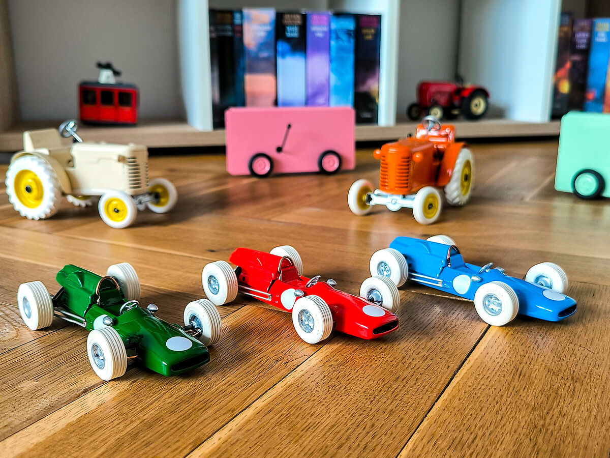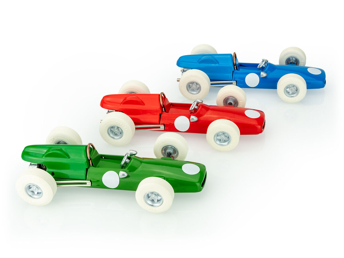 Plechový sběratelský model závodního vozu v pastelových barvách doplňují kontrastní bílé pneumatiky. Na designu a formule se podílelo česko-belgické studio.