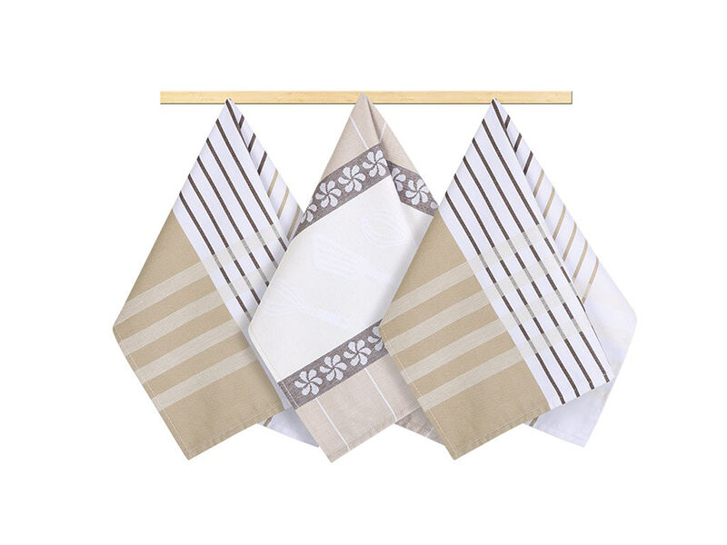 Kuchyňské utěrky jsou vyrobeny ze 100% bavlny o plošné gramáži 240g/m2. Jsou dostatečně velké a velmi dobře savé, v různých barevných variacích a dezénech. 100% bavlna zajišťuje dostatečnou savost použitého materiálu. Balení obsahuje tři kusy utěrek, barevnost utěrek může být odlišná oproti vyobrazení.
