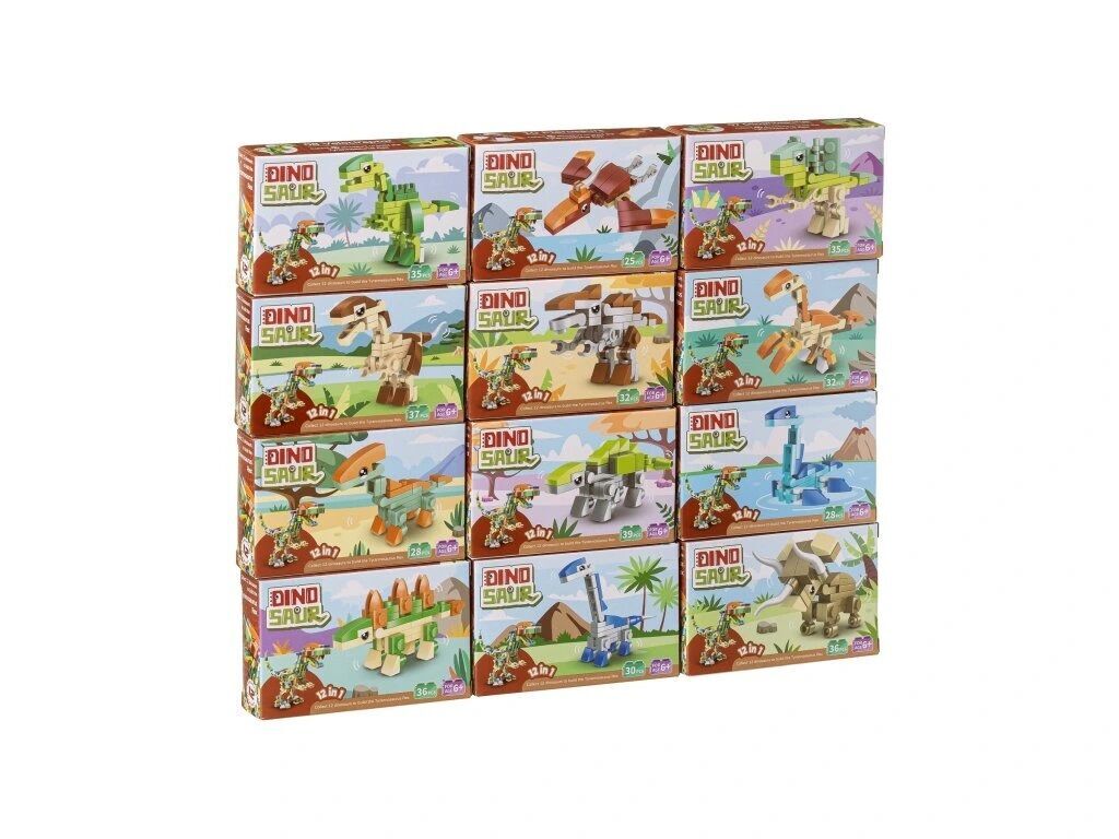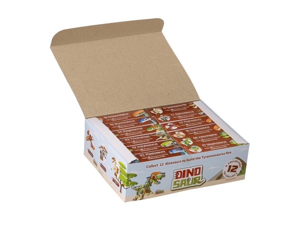 Kolekce 12 ks dinosaurů. Poskládejte si 12 malých dinosaurů anebo si z nich rovnou složte velkého Tyranosaura rexe. Pro složení T-rexe musí být k dispozici všechny kostičky z boxu. Z důvodu velkého množství specifických dílků je stavebnice vhodná spíše pro větší děti. Každý dinosaurus je balen v samostatné papírové krabici. Kostičky jsou v plastikovém obalu s návodem. Na návodu je vždy na jedné straně návod ke složení dinosaura z krabičky a na druhé straně je pak část návodu pro složení Tyranosaura rexe.