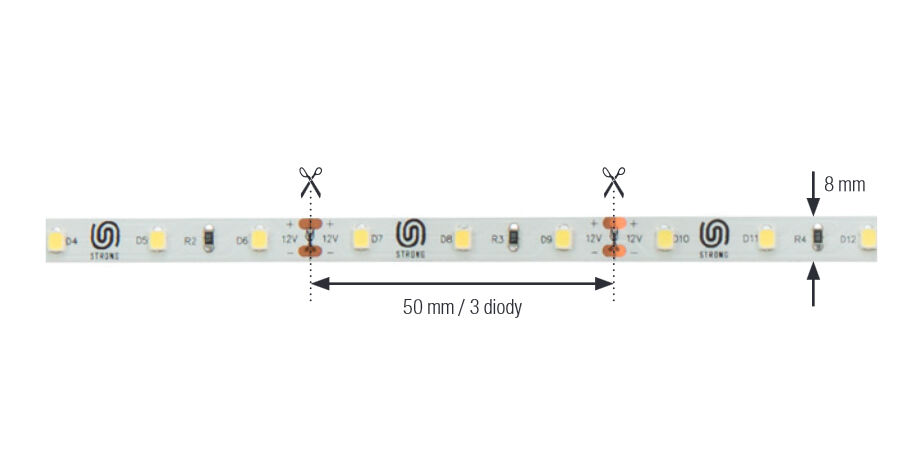 Baleno v rolích po 30 m, rozbalitelnost po 1 m ( lze krátit v označených místech po 3 diody, co cca 5cm, v těchto místech lze i opětovně propojovat). Při odběru kratších LED pásků krátíme na nejbližší kratší dělící místo. Tolerance je cca 1cm na metr délky. Instalace: pájením. Při instalaci nutno zabezpečit odvod tepla. Lamino, sklo apod. nezabezpečují dostatečný odvod tepla, LED pásek se přehřívá, zkracuje se jeho životnost a může dojít k jeho poškození. Doporučujeme umístění do příslušných ALU profilů zabezpečujících odvod tepla. Při použití bez těchto profilů doporučujeme pro instalaci na lamino použít kvůli odvodu tepla hliníkovou lištu. Připojování kabelu: pájením nebo rychlospojkou