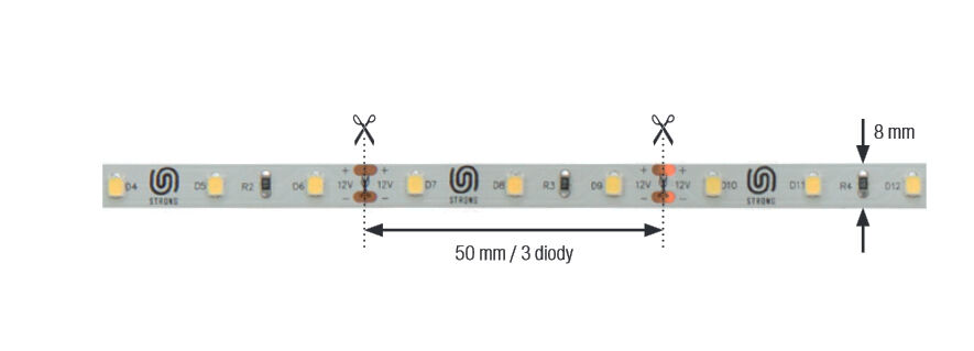Baleno v rolích po 50 m, rozbalitelnost po 1 m ( lze krátit v označených místech po 3 diody, co cca 5cm, v těchto místech lze i opětovně propojovat). Při odběru kratších LED pásků krátíme na nejbližší kratší dělící místo. Tolerance je cca 1cm na metr délky. Připojování kabelu: pájením nebo rychlospojkou Tento typ není vodoodolný!