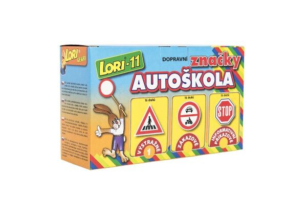 Dětská stavebnice LORI 11 autoškola a dopravní značky. Balení obsahuje 16ks dopravních značek, 2 kužely a auto.