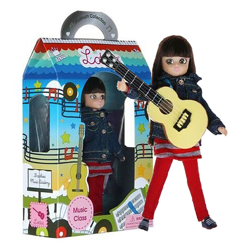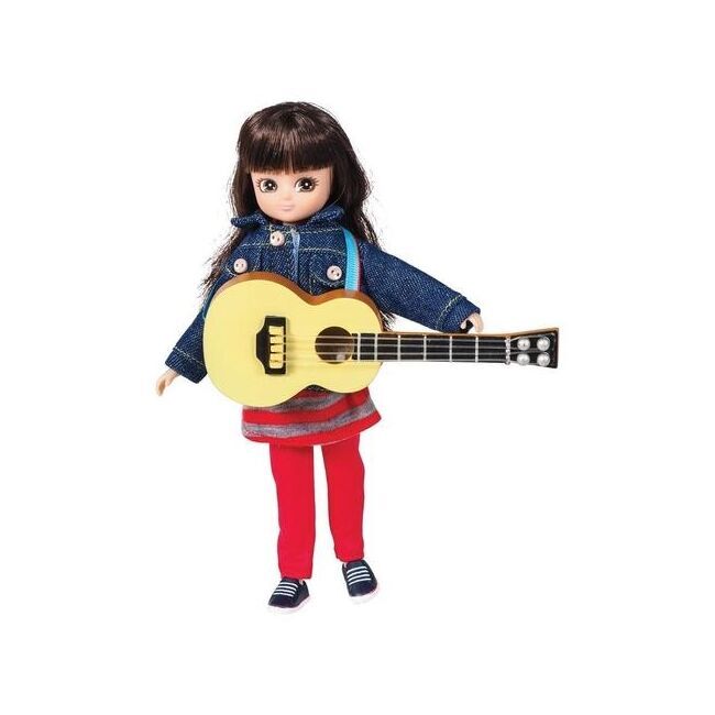 Tato roztomilá panenka muzikantka má oblečenou džínovou bundu, pruhované šaty, červené legíny, tenisky. Hraje na akustickou kytaru a s sebou má také stojan na noty.