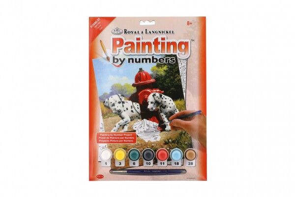 Malování podle čísel Dalmatini u červeného hydrantu 22x30cm s akrylovými barvami a štětcem na kartě