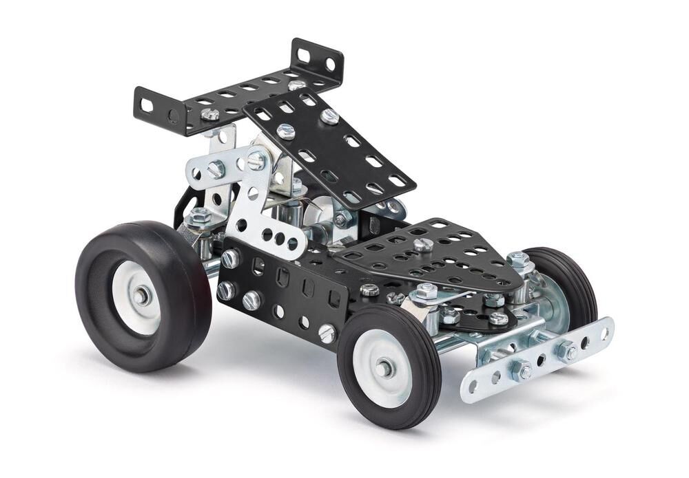 Stavebnice Merkur terénního autíčka Buggy, vhodná pro začínající konstruktéry a stavitele. Ze stavebnice je možné podle návodu sestavit 10 různých modelů. S vytvořenými modely si můžete i hrát a nejen stavět.