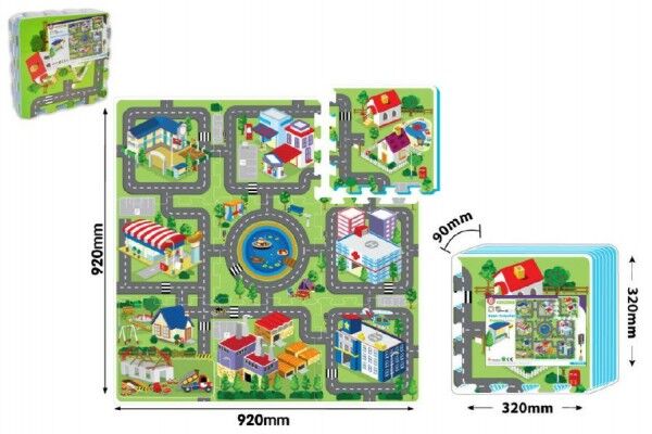 Pěnová podložka rozvíjí senzomotorické schopnosti, myšlení, kreativitu a soustředěnost. 9 dílů s motivem města je vyrobeno z bezpečného materiálu, který je měkký, omyvatelný, lehký, odolný a zároveň skvěle izoluje a tlumí hluk.