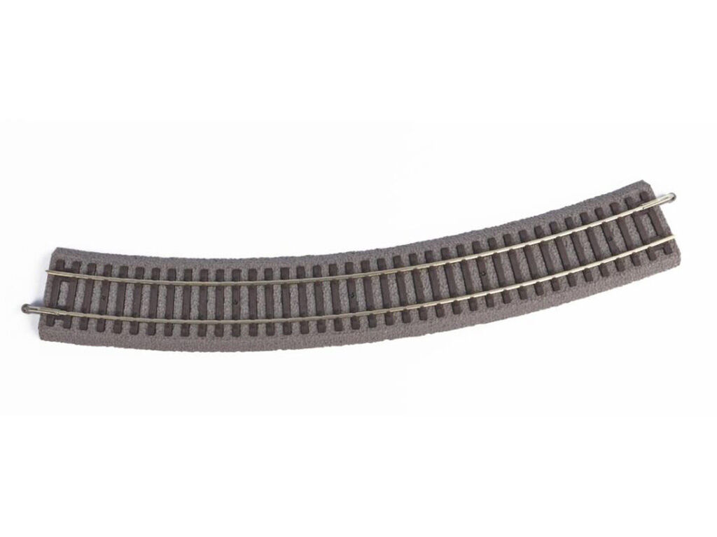 Oblouková kolej s detailní reprodukcí dřevěných pražců na štěrkovém podloží, ve věrných barvách.