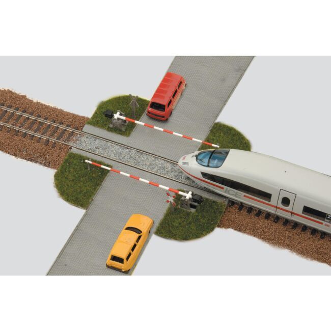 Závory železničního přejezdu. Zachovejte bezpečnost provozu i při hře!